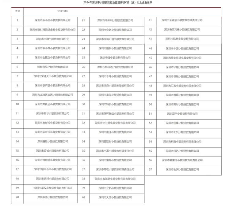 根据公告,根据《关于加强小额贷款公司监督管理的通知》(银保监办发〔2020〕86 号)《深圳市小额贷款公司试点管理暂行办法》(深府〔2011〕135 号)等文件要求,为全面评估深圳市小额贷款公司整体经营状况,规范小额贷款公司经营行为,探索实现行业分级分类监管,深圳市地方金融管理局局组织开展2024年深圳市小额贷款行业监管评级工作。