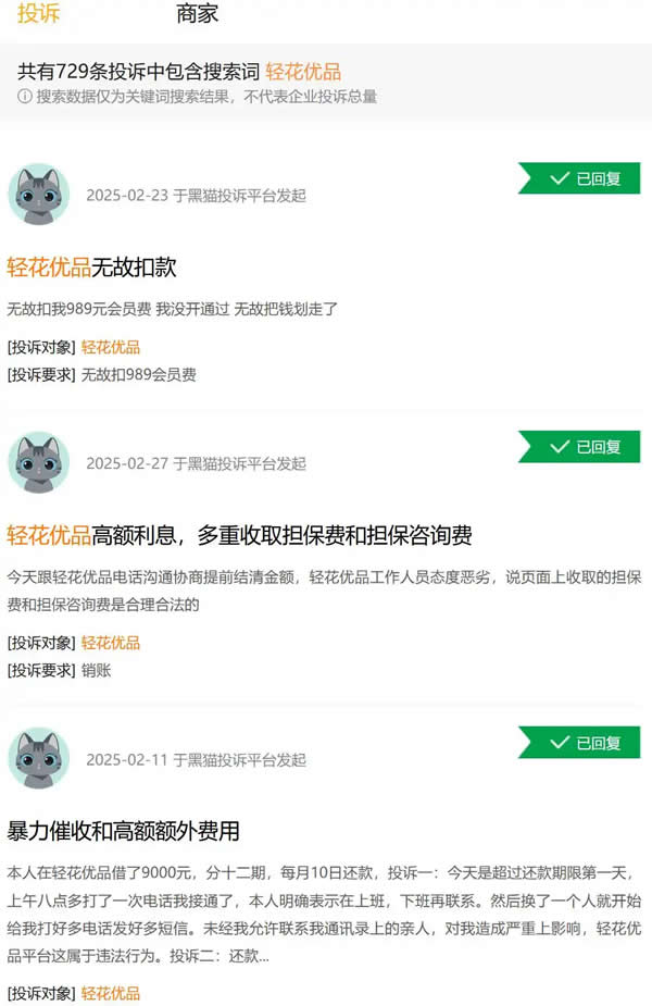 截至2025年3月13日,黑猫投诉平台显示,轻花优品投诉达729条,主要涉及未经同意扣除会员费(459-1299元)、担保费及暴力催收。平台通过“双融担模式”引入深圳华融融资担保有限公司和福建永鸿兴融资担保有限公司等,分别收取费用,将超出24%的利息隐藏其中。