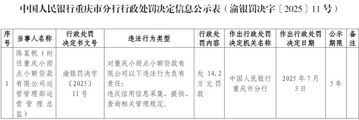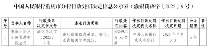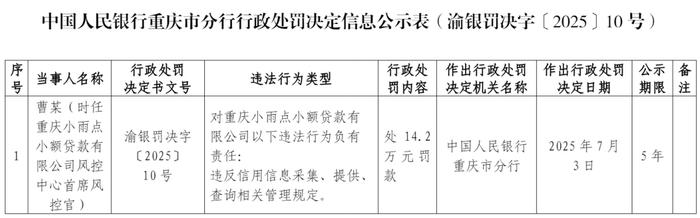 近期,重庆小雨点小额贷款有限公司因违反信用信息采集、提供、查询相关管理规定,被处以249.1万元罚款。时任小雨点小贷风控中心首席风控官曹某和公司运营管理部运营管理总监陈某帆均对违法违规行为负有责任,分别被处以14.2万元罚款,处罚公示期限五年。背靠以李家诚为代表的香港李兆基家族,这是小雨点小贷自成立十年以来首次被罚,而这一金额也刷新了央行对小贷公司开出的罚单金额新高,由此引发了业内极大关注。