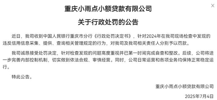 虎讯APP注意到,针对此次被罚,小雨点小贷在官网公告回应后,对媒体也进行了多次回应。7月4日,小小点小贷官网公告回应称:“我司诚恳接受处罚决定,针对检查发现的问题高度重视并已第一时间完成自查和整改。后续,公司将进一步完善内部控制机制,切实做到依法合规、审慎经营。同时,公司日常运营和各项业务均保持正常稳定运行”。