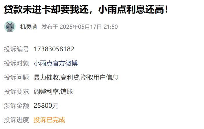 通过上述信息综合来看,重庆小贷公司的本金、利息及罚息,最高年化率不应超过24%,超过部分,在借款合同纠纷的审理中,很难获得法院和地方监管的支持。据黑猫平台信息显示,小雨点的累计投诉量为2200条,近30天为23条。其中,亦有用户对其“利率较高”的投诉。