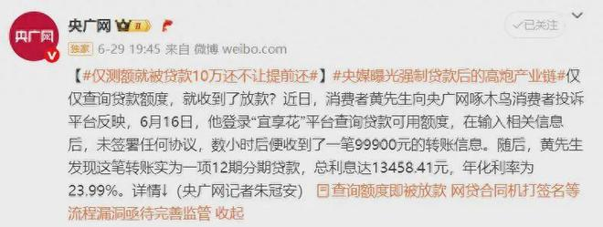 近期,一款名为“宜享花”贷款软件因存在强制放款情况,被各大媒体报道引起不小的轰动。一次好奇的“查额度”,竟让银行卡秒增10万贷款,年利率高23.99%,这不是科幻剧情,而是消费者黄先生的真实遭遇。