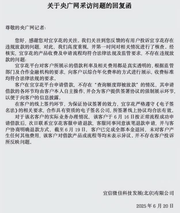 面对投诉,宜信微佳科技公司最初矢口否认存在问题。他们在6月20日回应称:“所有操作均由客户本人自主完成,不存在‘查询额度即被放款’情况。