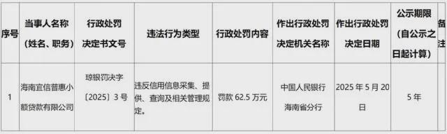 2025年5月26日,海南宜信普惠小额贷款有限公司(简称“宜信小贷”)因“违反信用信息采集、提供、查询及相关管理规定”,被处以62.5万元罚款。时任执行总经理伍某润同时被追加处罚10万元。
