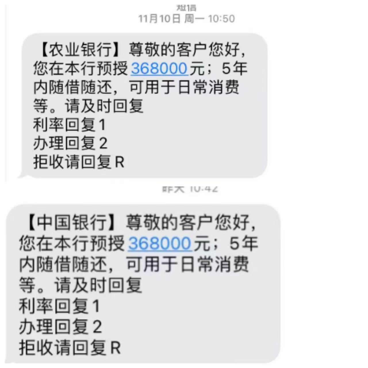 只要你回复了1或2,就证明你是有资金需求的人,那些中介的电话分分钟就给你打电话,也会自称是这个银行的人邀约你上门办理贷款。