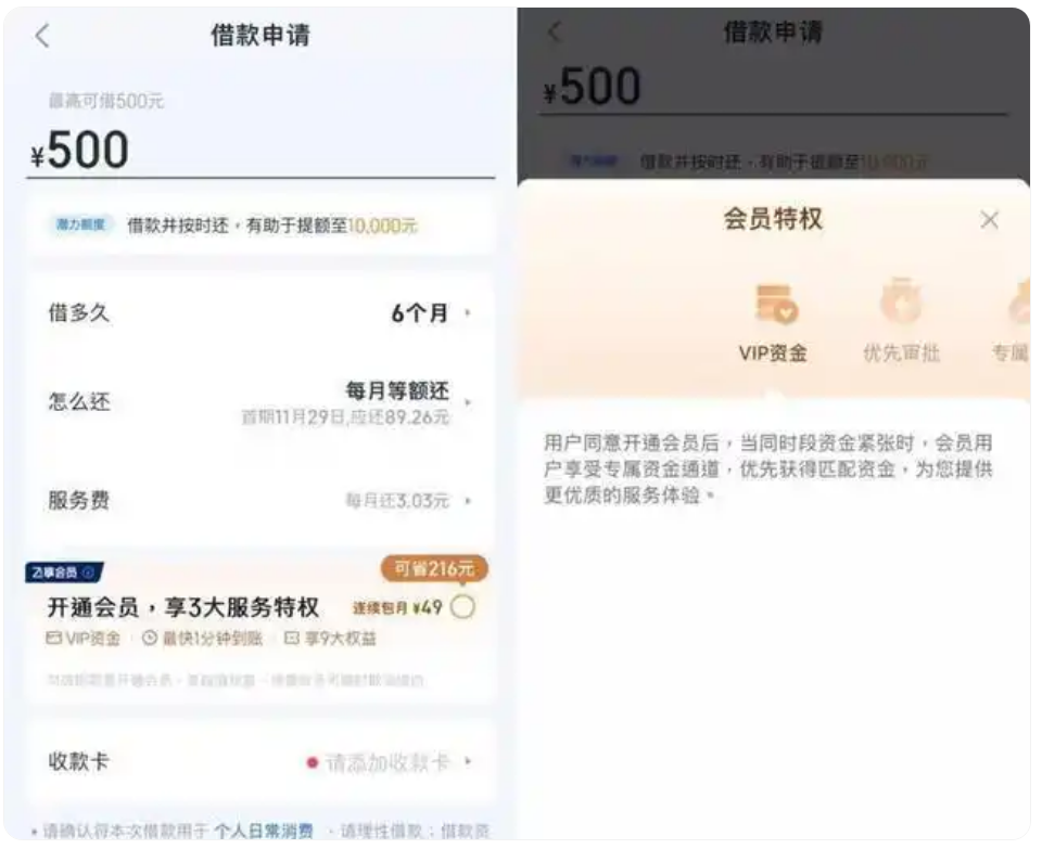 三家公司名义上是会员服务方,会员权益写着VIP资金、优先审批、专属提额、还款立减等,会员费价格写得明明白白,单月卡149元、续费月卡119元、季卡349元,理论上这是“可选项”,但现实中会变成能否借到钱的门槛;