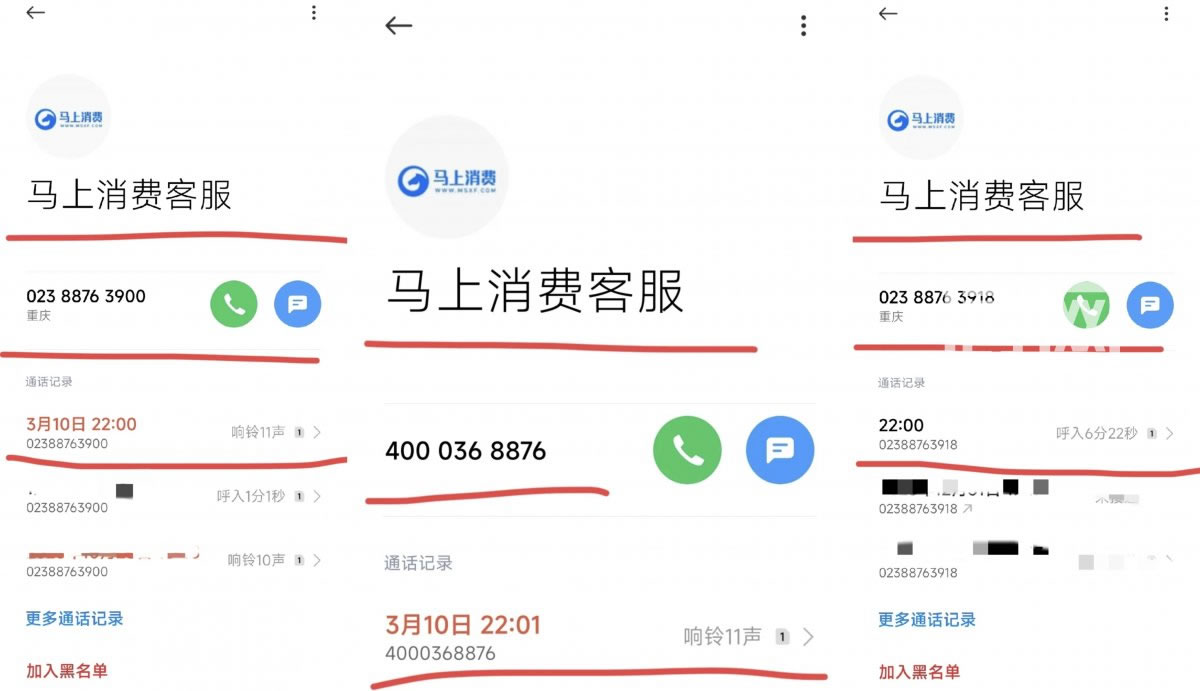 史先生在马上消费金融借的网贷逾期了,3月10日22时整,史先生的手机响起,是一个023开头尾号3900的号码打来的,手机识别该号码为“马上消费客服”。没等史先生接听,这通电话就挂断了。22时01分,一个400开头但同样显示为“马上消费客服”的电话打了进来,“电话我没接,响铃11声之后就挂断了。”3月11日22时,一个023开头尾号为3918、被手机识别为“马上消费客服”的电话打了进来。这一次,史先生接起了电话,跟对方进行了6分多钟的通话。