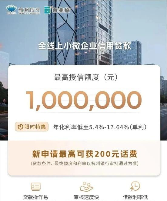 百业贷是杭州银行(全称:杭州银行股份有限公司)推出的一款针对小微企业的线上企业税贷产品,额度最高100万,企业满1年可申请,准入门槛宽松。支持提前还款,且无违约金。该产品以税定额,申请简便,放款速度快,目前仅接受浙江省的小微企业主申请。总的来说,百业贷是一种高额低息的融资贷款产品,旨在解决小微企业的资金问题。