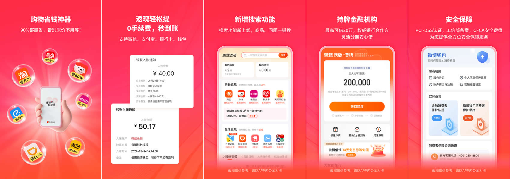 微博借钱,是(北京微聚未来科技有限公司)提供的信贷服务产品,该产品主要面向微博平台内25-45岁的用户群体,依托用户在微博的活跃度、社交关系及信用数据,微博借钱APP还为用户提供了钱包管理、充值、提现、支付、授信申请等多项综合服务。结合风控模型授予500-100000元消费信贷额度,合作机构覆盖光大银行、新网银行等40余家持牌金融机构。