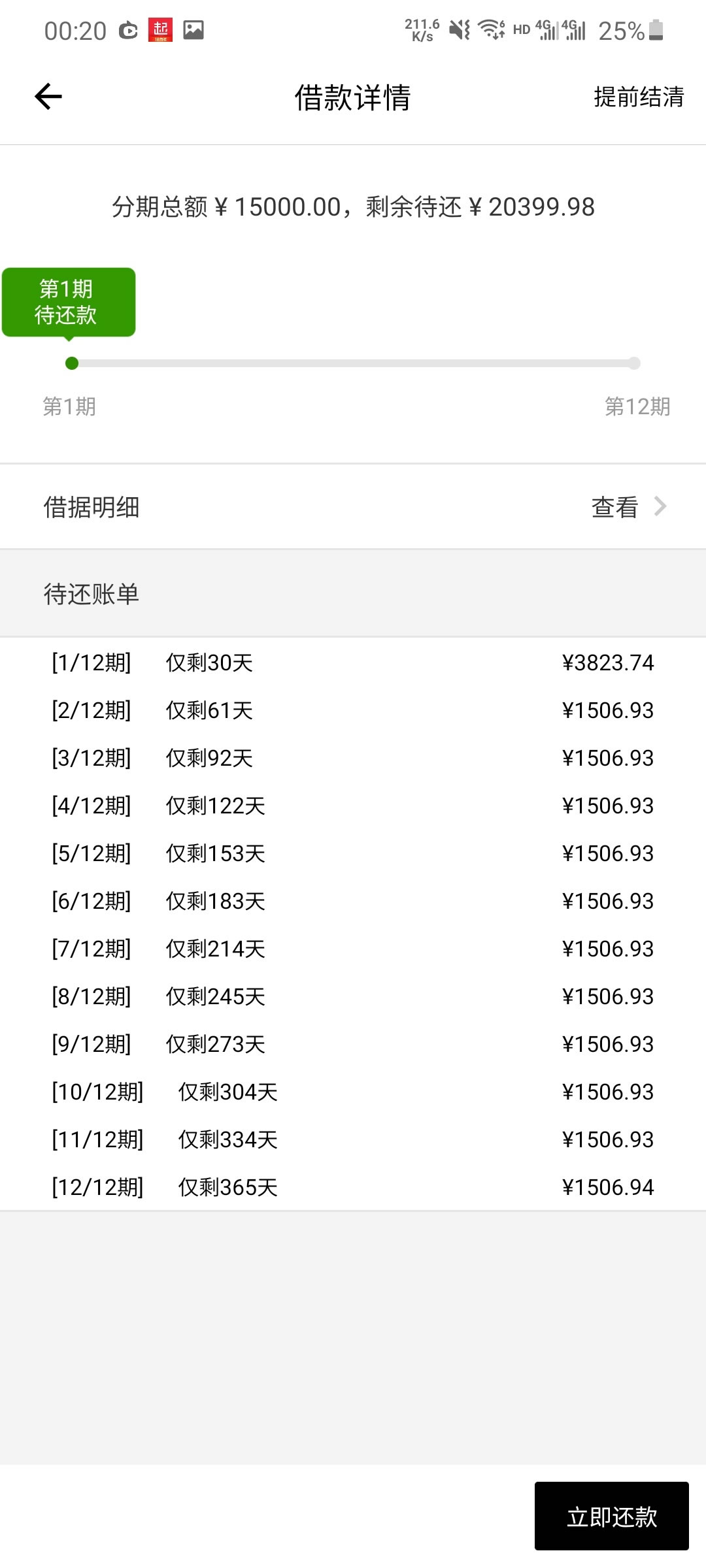 在洋钱罐借款15000元,选择分12期还款,最终总还款金额高达20399元,综合年化费率超过70%。
