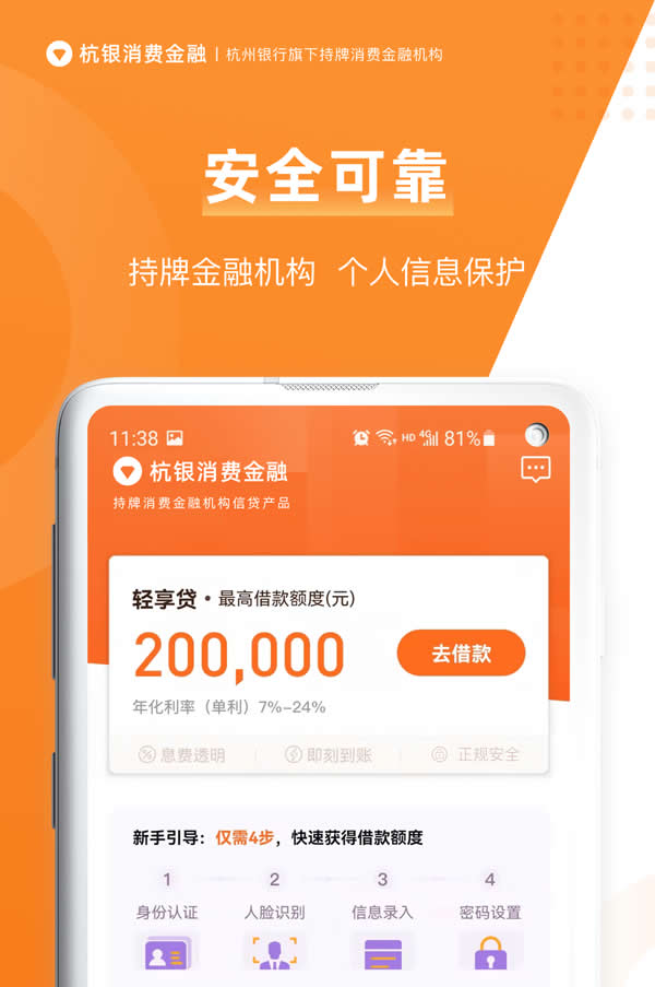 轻享贷杭银消费(全称:杭银消费金融股份有限公司)提供的一款最高20万额度的线上个人信贷产品,具有准入宽松、流程便捷、用款灵活的优势。