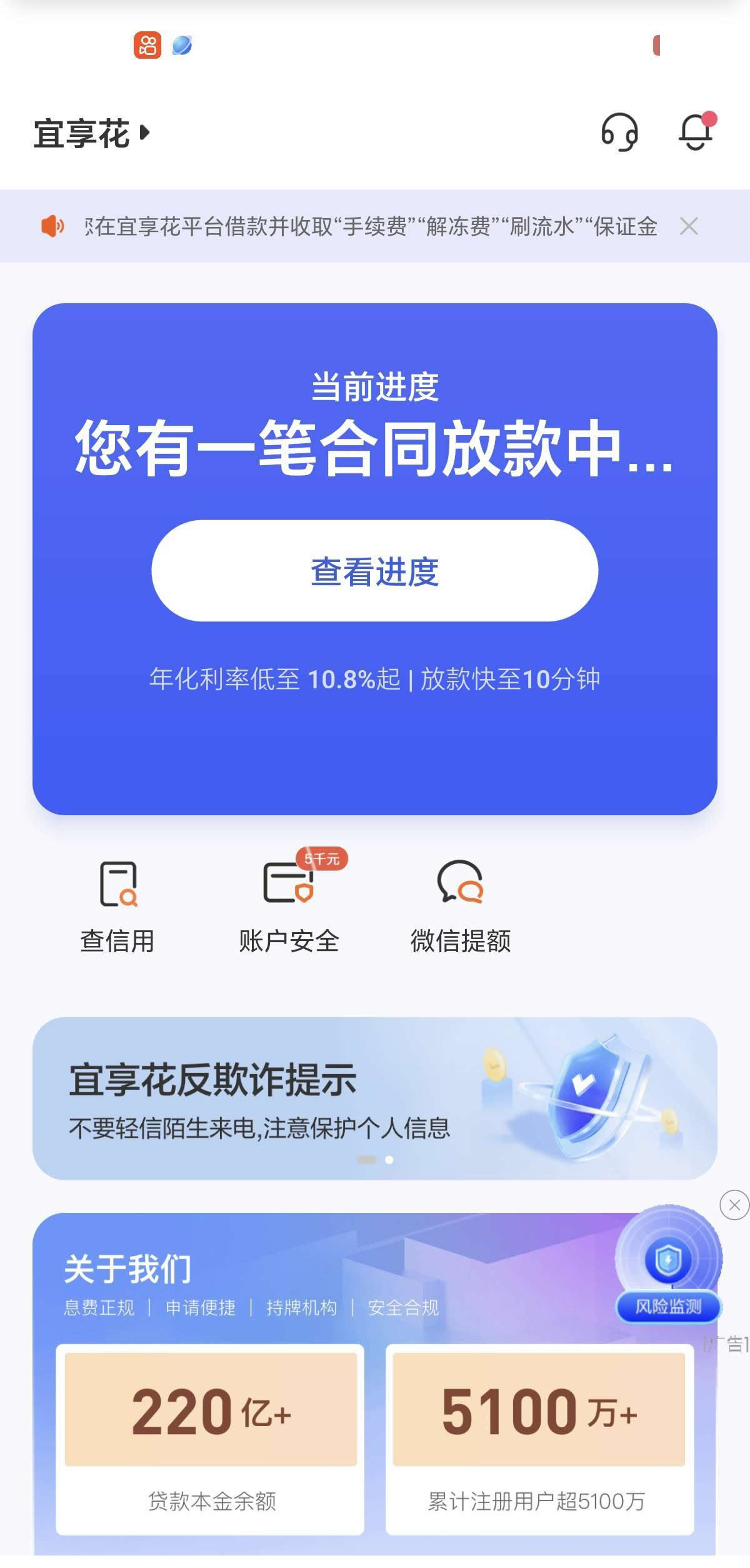 宜享花,是宜信小贷(全称:海南宜信普惠小额贷款有限公司)提供的一款便捷的线上、高额度、低息费、无抵押的三方助贷产品。消费分期服务,其征信门槛相对较低,凭身份证+银行卡即可申请,简单三步操作,即可享受宜享花为您提供的专属额度,但仍有一定的要求。24小时放款最快10分钟内到账,一次申请,循环使用,三步申请,随还随借。