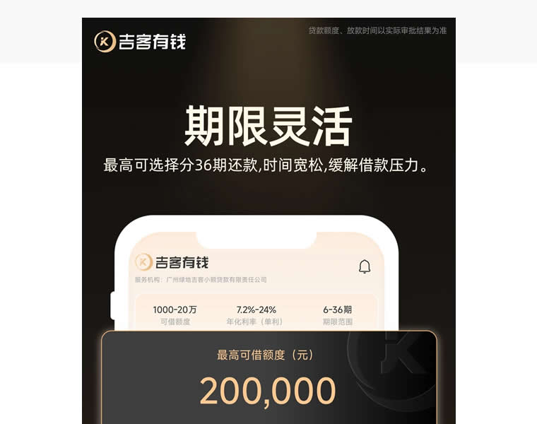 吉客有钱APP是绿地吉客小贷(全称:广州市绿地吉客小额贷款有限责任公司)推出的线上贷款产品,为用户提供便捷的借钱、借款、贷款平台,急需用钱、借钱吉客有钱。小额贷款、借款、贷款、多种分期借钱方式供你选择,旨在满足用户在生活及消费场景方面的资金需求,您身边的分期消费金融管家。