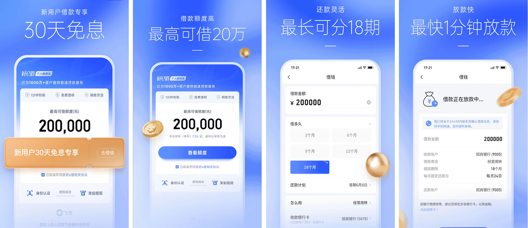 好e借,是飞泉小贷(全称:广州飞泉小额贷款有限公司)(广州飞泉融资担保有限公司)联合各大持牌金融机构,面向个人用户开放申请的一款三方助贷产品,主要为有金融需求的小微商户、个人消费者提供金融贷款服务。最高可借额度20万;借款流程简单,线上全自动化信审,最快1分钟放款;最长可分18期;全程线上申请,无抵押贷款。新用户借款0息费借30天。