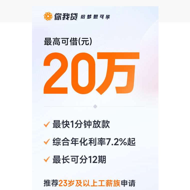 “你我贷借款”是(全称:上海你我贷互联网金融信息服务有限公司)基于大数据分析,全线上审核,申请简单,息费透明,实现真正的快速放款的信贷类产品。最高可提供20万元借款额度,满足不同场景需求(如日常应急、创业资金等),线上无抵押申请,通过大数据分析简化流程,部分用户可快速完成审批。