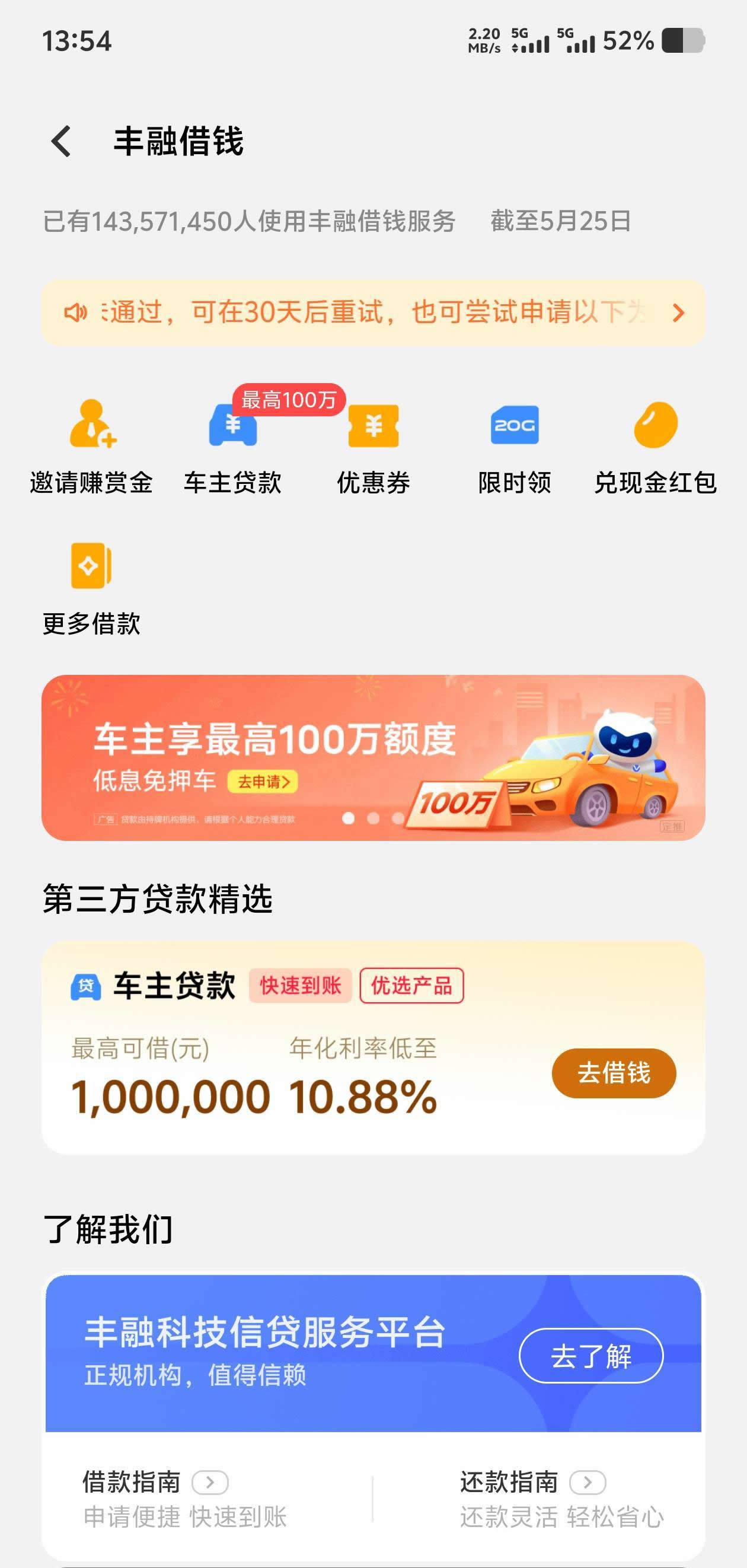 丰融借钱,是(深圳市丰融网络科技有限公司)提供的一款三方助贷产品,作为信贷科技的服务品牌,丰融借钱提供方便、快捷、安全的金融服务,只需身份证和手机号即可在线申请,额度可高达20万元。线上全自动化信审,节省时间,机即可申请,简单便捷,适合各类人群。