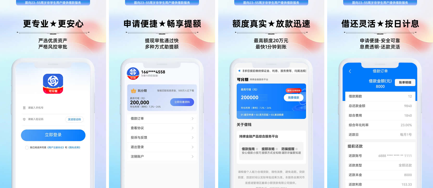 可分期,是(黄冈市龙感湖管理区鑫荣小额贷款有限公司)提供的一款个人信贷产品,您的智能金融助手,致力于为用户提供方便、快捷、安全的分期服务。可分期都能满足您的资金需求。全程线上操作,无需抵押,灵活分期,让您的资金管理更轻松!