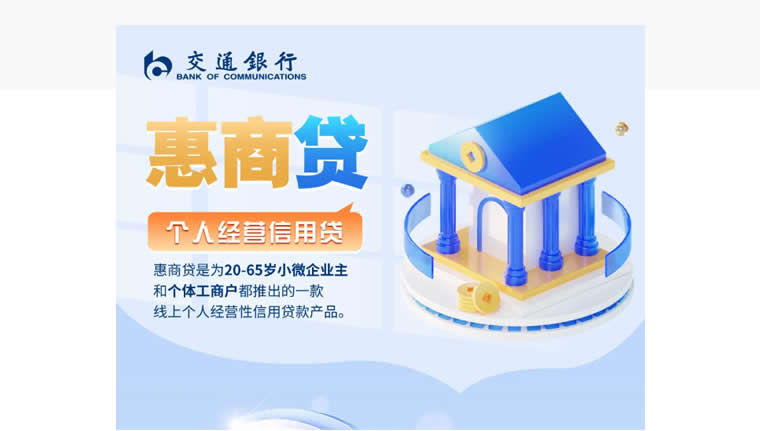 惠商贷是交通银行(全称:中国交通银行股份有限公司)面向小微企业主和个体工商户的线上个人经营性信用贷款产品。无需抵押或担保,完全基于申请人的经营数据(如纳税、银联收款等)和征信记录进行额度评估。
