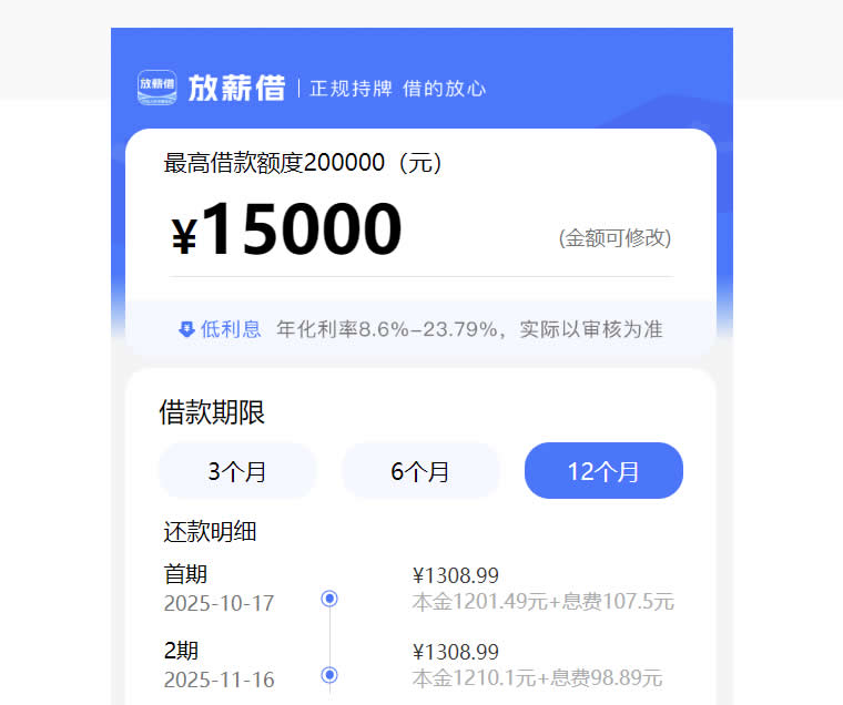放薪借一年轻人的借款钱包,线上拿钱快!最高20万,最快2小时下款。