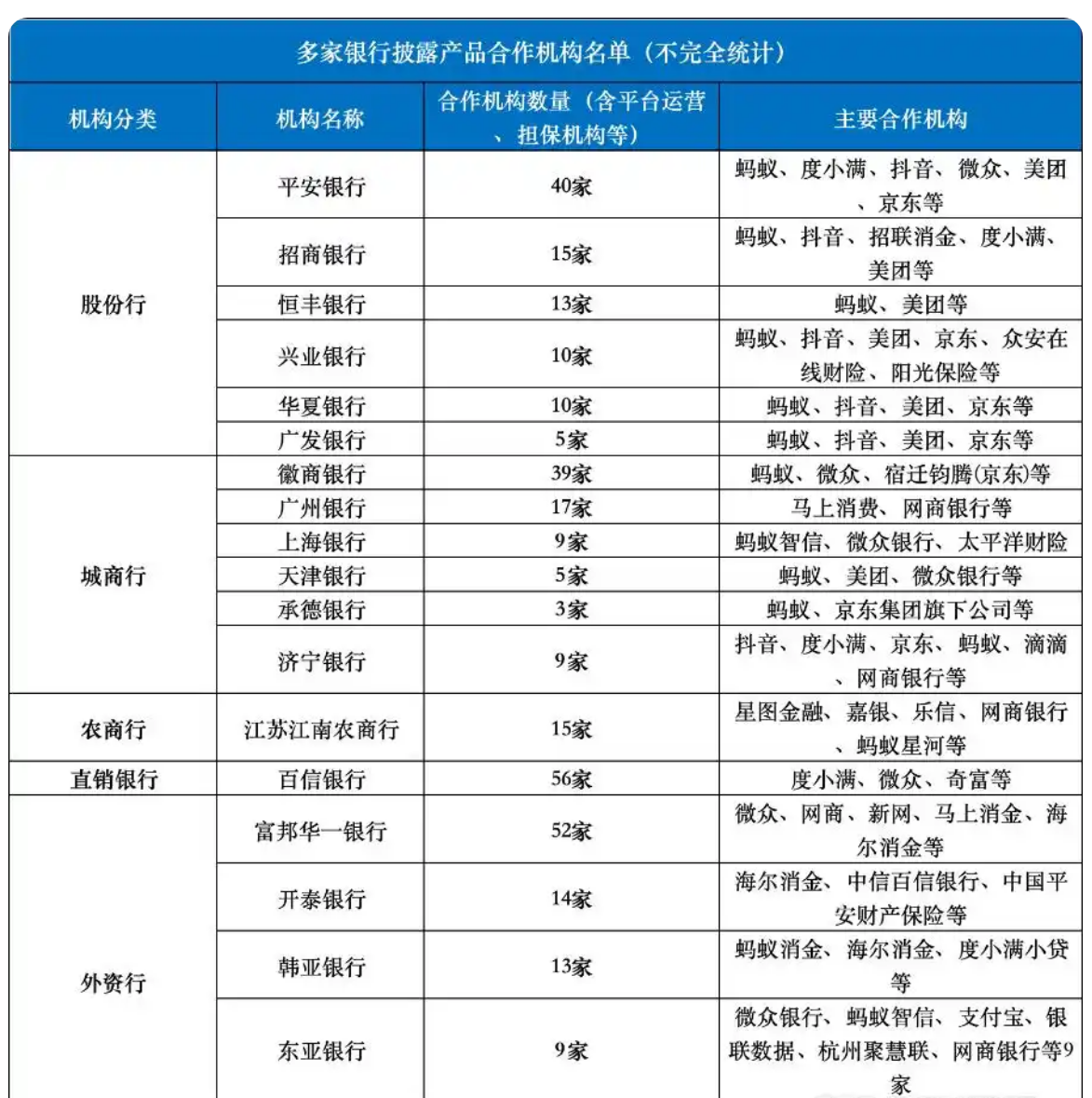 从已公布的名单来看,市场格局初现轮廓:银行偏好合作的机构类型较为集中,多家与蚂蚁、京东、腾讯等互联网巨头关联的机构频繁出现在各银行白名单中,大型互联网平台旗下机构、头部民营银行、持牌金融机构及融资担保公司成为主流选择。