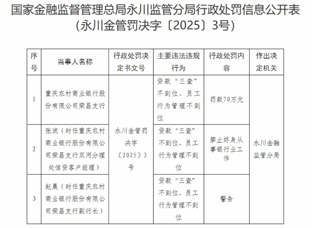 根据行政处罚决定书,重庆农村商业银行股份有限公司荣昌支行存在贷款“三查”不到位、员工行为管理不到位的违法违规行为。永川金融监管分局依据《中华人民共和国银行业监督管理法》等相关法律法规,对重庆农商行荣昌支行的违法行为作出处罚决定。同时,时任该行双河分理处信贷客户经理的张波被禁止终身从事银行业工作;时任副行长的赵晨因管理失职受到警告处罚。