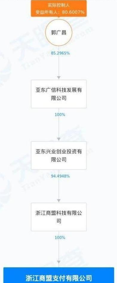 工商信息显示,商盟支付由浙江商盟科技有限公司100%控股。股权穿透后,商盟支付的实际控制人是复星的实控人郭广昌。