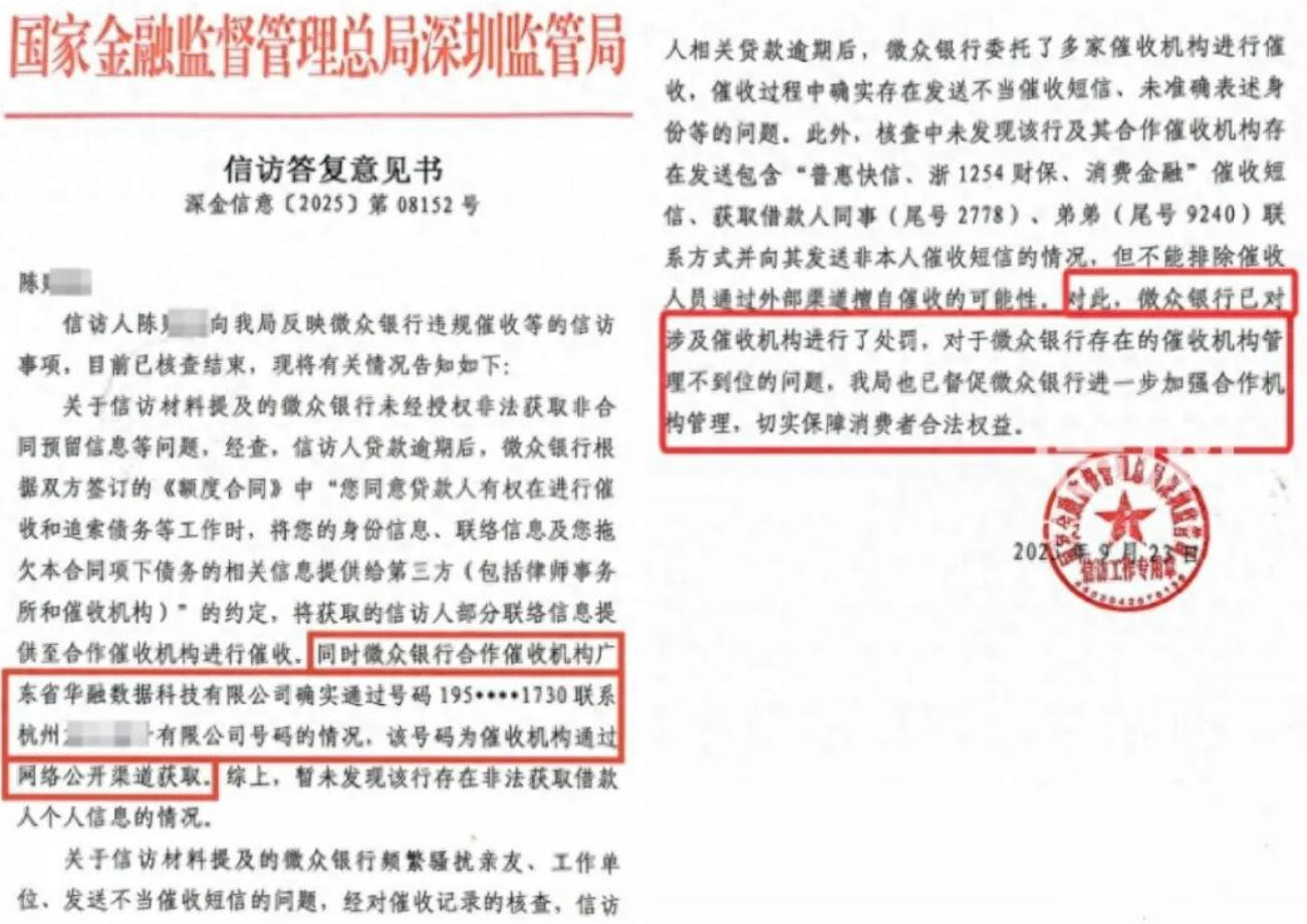 监管部门在答复中同时表示,微众银行委托的多家催收机构,在催收过程中确实存在发送不当催收短信、未准确表述委托身份等违规问题。针对核查中未发现、但不能排除催收人员通过外部渠道擅自实施的骚扰行为,微众银行已对涉事催收机构作出处罚。