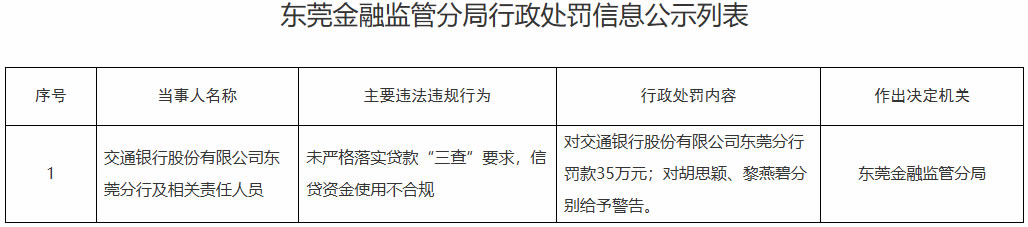 东莞金融监管分局对交通银行股份有限公司东莞分行罚款35万元;对胡思颖、黎燕碧分别给予警告。