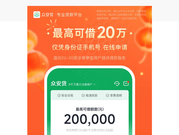 众安贷是众安小贷(全称:重庆众安小额贷款有限公司)提供的无抵押,纯线上消费信贷平台,专注为个人和小微企业主提供即时到账的贷款服务。基于成熟专业的风控能力对客户信用进行整体评估,3步借款上限高达20万,平均5秒以内放款。