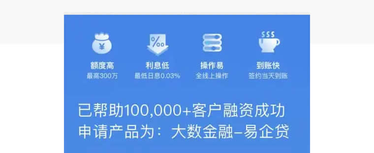 “易企贷”是大数金融(全称:深圳前海大数金融服务有限公司)专门为中小企业量身打造的一款贷款产品。就好比是一把精准适配中小企业资金需求大门的钥匙。
