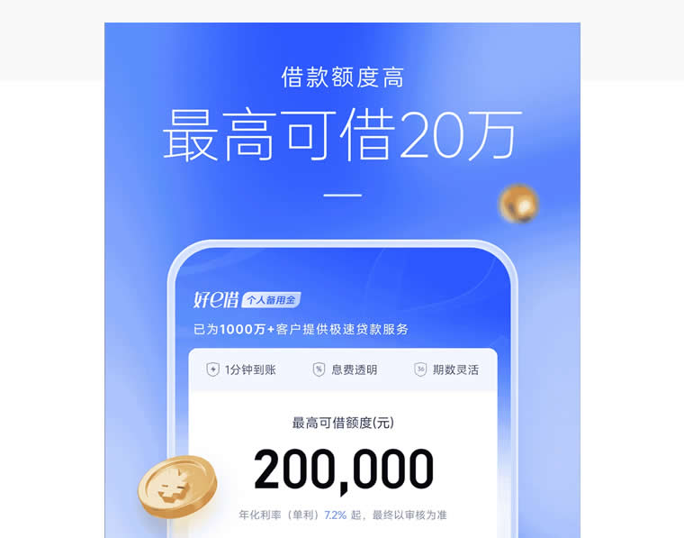 2、放款快:借款流程简单,线上全自动化信审,最快1分钟放款;