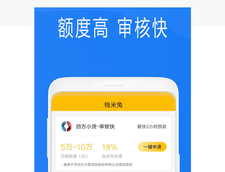钱米兔app是大诚小贷(全称:遂宁市船山区大诚小额贷款有限公司)推出的一款专门为客户提供贷款服务的产品。满足多层次用户的个性化借款需求。额度可循环、分期还款安全可靠,随借随还无压力;全新线上贷款借钱流程,进一步提升客户申请、到账时间,一键申请,帮您解决您的燃眉之急!自动化审核,操作简单,一步申请!满足多层次客户需求,最高可借额度8万!合规贷款机构产品利息低!年化利率最高不超过36%!