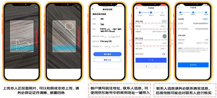 3、客户填写居住地址,联系人信息,可使用京东账号中的常用地址一键带入