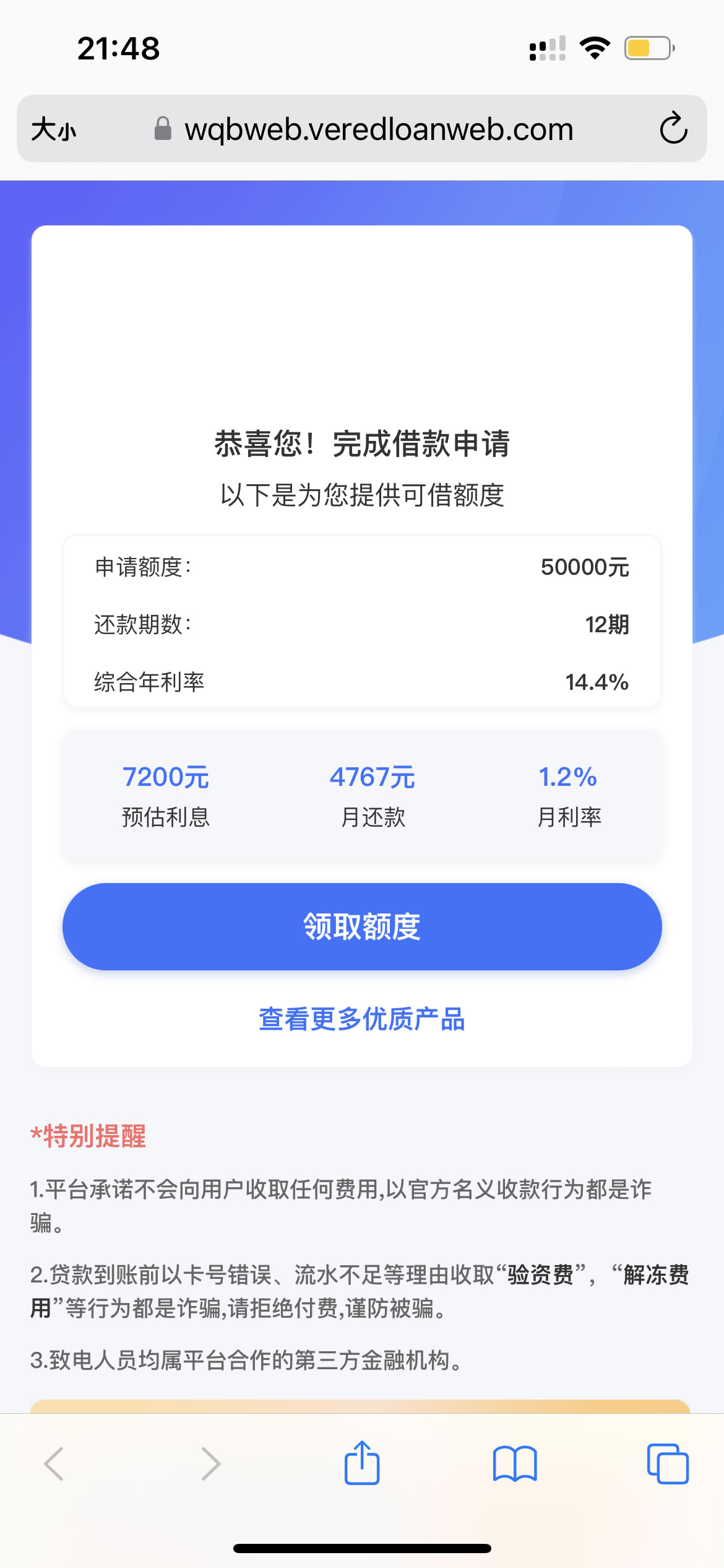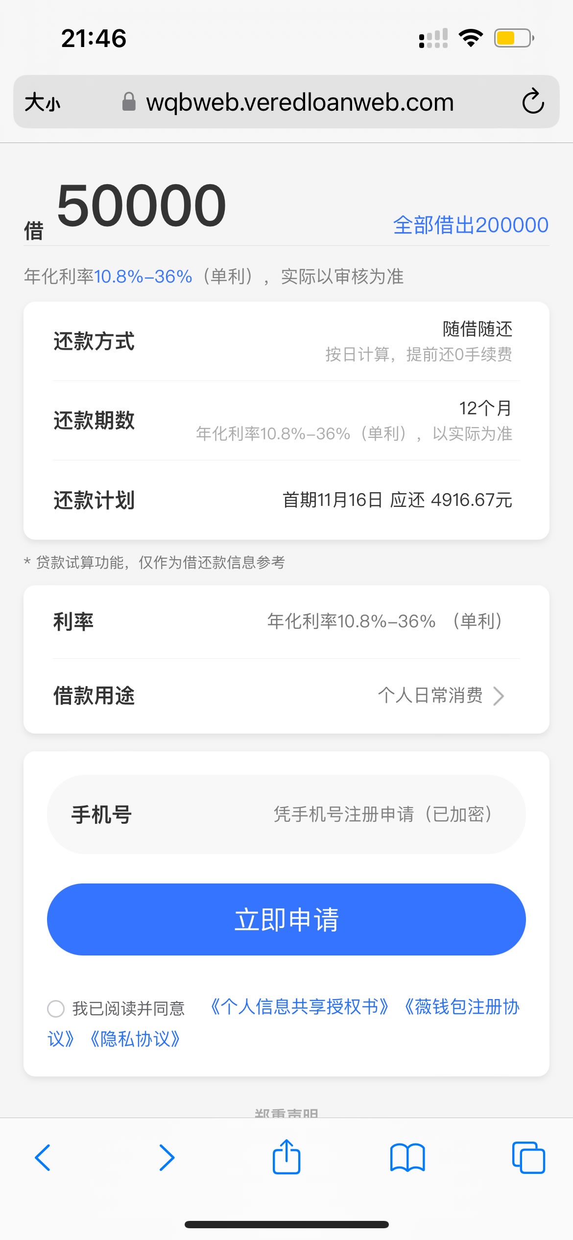 | 还款方式 | 等额本息 | 所属机构 | 小薇科技小额再贷款(大连)股份有限公司 |